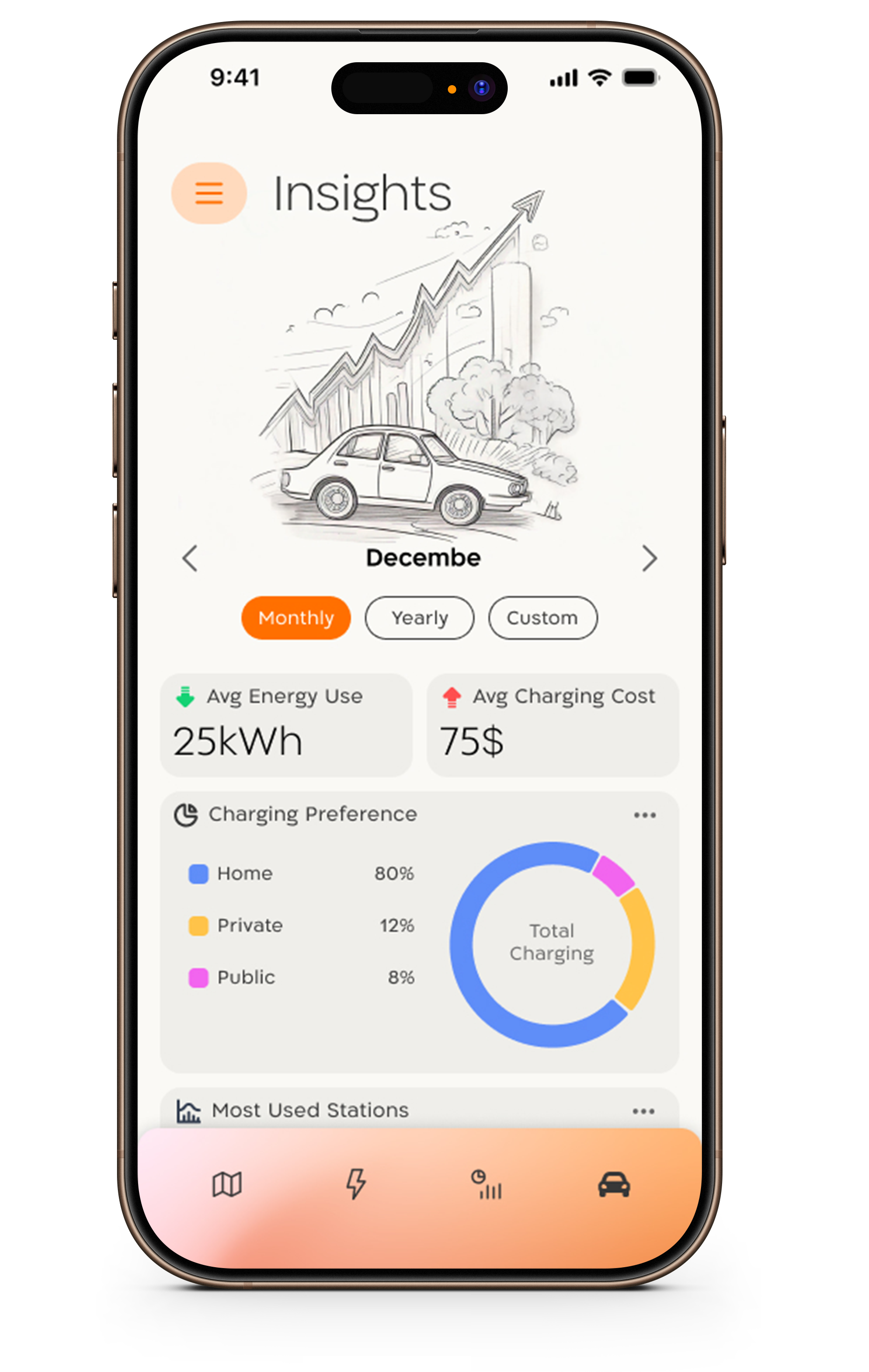 Provides monthly and yearly energy consumption data, charging patterns, and cost analysis for smarter driving decisions.