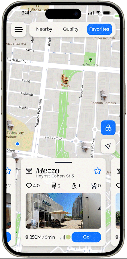 In my research, I discovered that users especially elderly people, parents with babies, people with disabilities, and tourists often search for public restrooms in stressful situations where time is critical. The speed of finding and accessing restrooms directly affects user satisfaction and their willingness to use the app again. To solve this, I designed a smart map with a one-click quick search for nearby restrooms, including real-time availability filters.