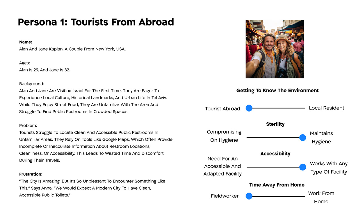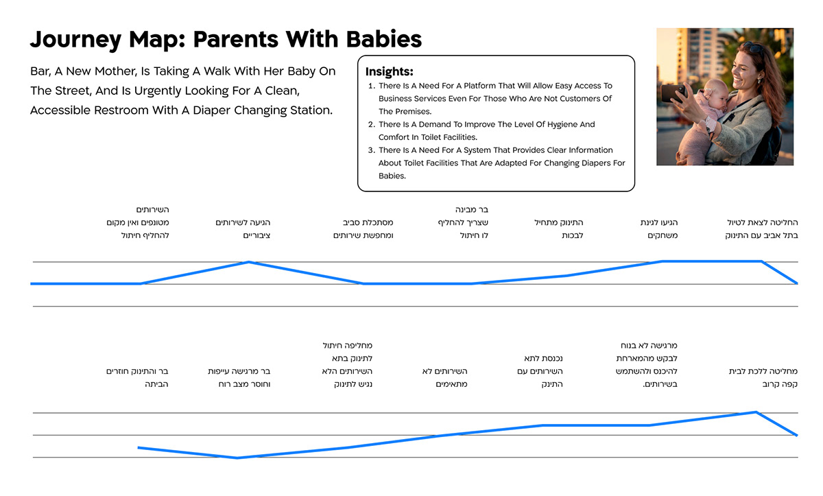 User Persona & Journey MapBased on the personas provided, we identified distinct user groups with unique needs and challenges when accessing restrooms. These personas helped shape the solutions and features offered by One&Two