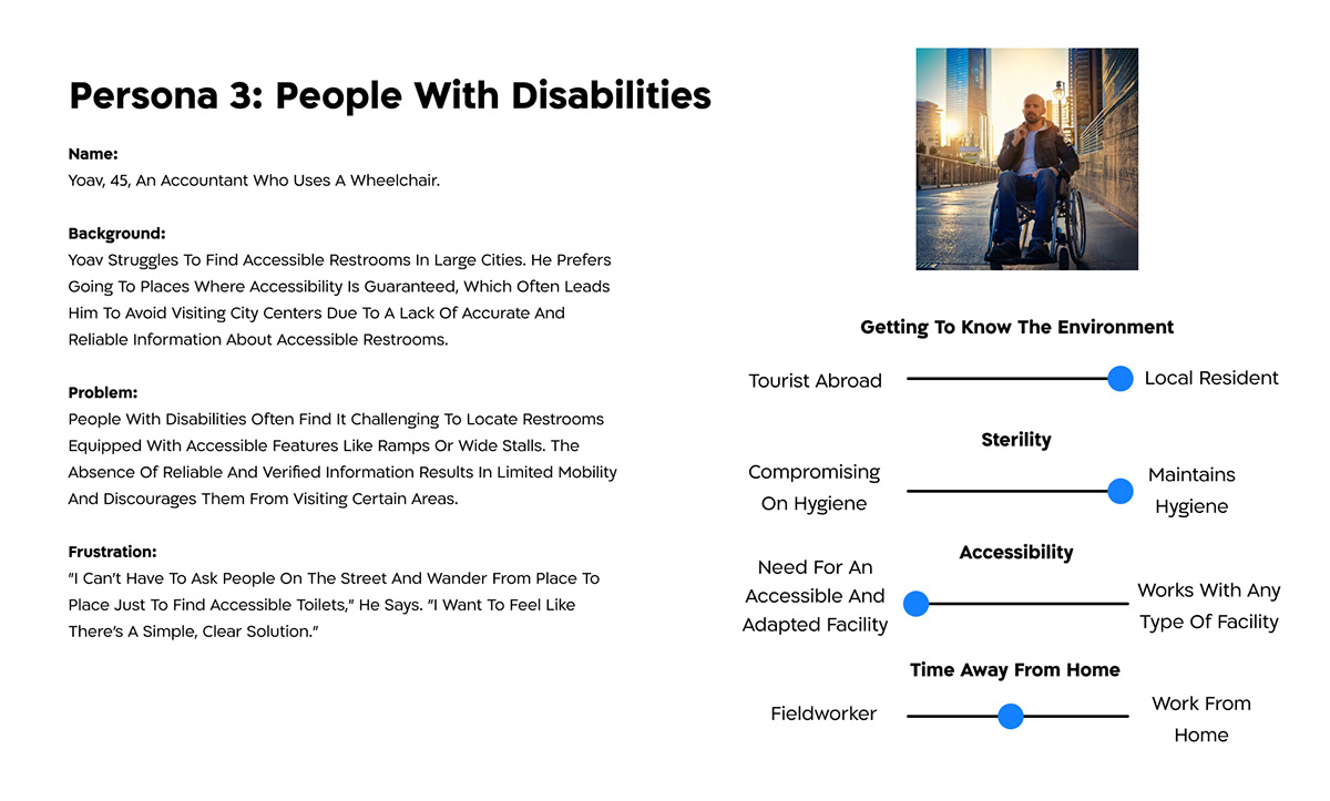 During registration, users answer a few questions to match restrooms to their needs. For example, people with disabilities find accessible facilities, and parents locate restrooms with changing stations. The system learns user habits to improve future searches.