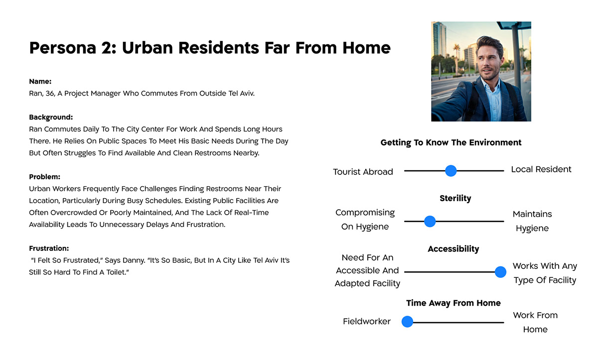 The idea for One&Two originated from a personal experience. During a busy day in Tel Aviv, I struggled to find a clean and accessible public restroom. Despite being in a dense urban area, none of the available options met basic hygiene or accessibility expectations.