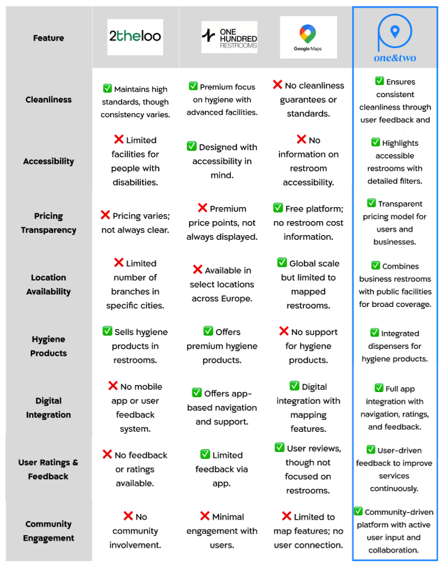 For Users: A seamless way to find clean, accessible restrooms. For Businesses: A tool to increase visibility and revenue.For Communities: Improving urban hygiene and accessibility standards.One&Two bridges critical gaps in public restroom services, creating value for users, businesses, and urban communities alike.