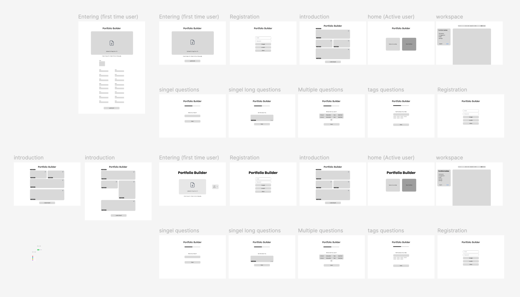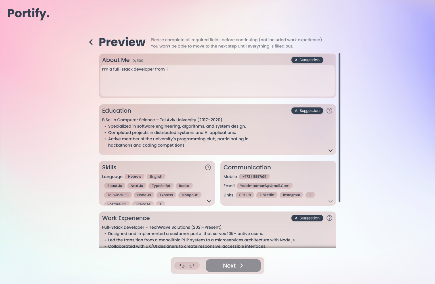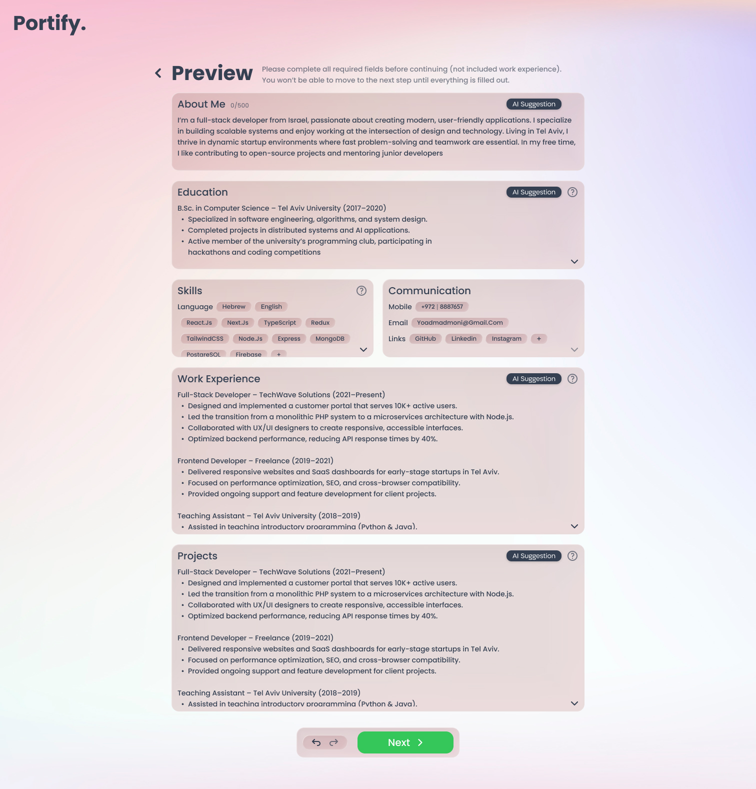 Smart User OnboardingGuided questions that collect and structure user information to generate a complete CV and portfolio especially when no CV is provided or when uploaded data is incomplete.