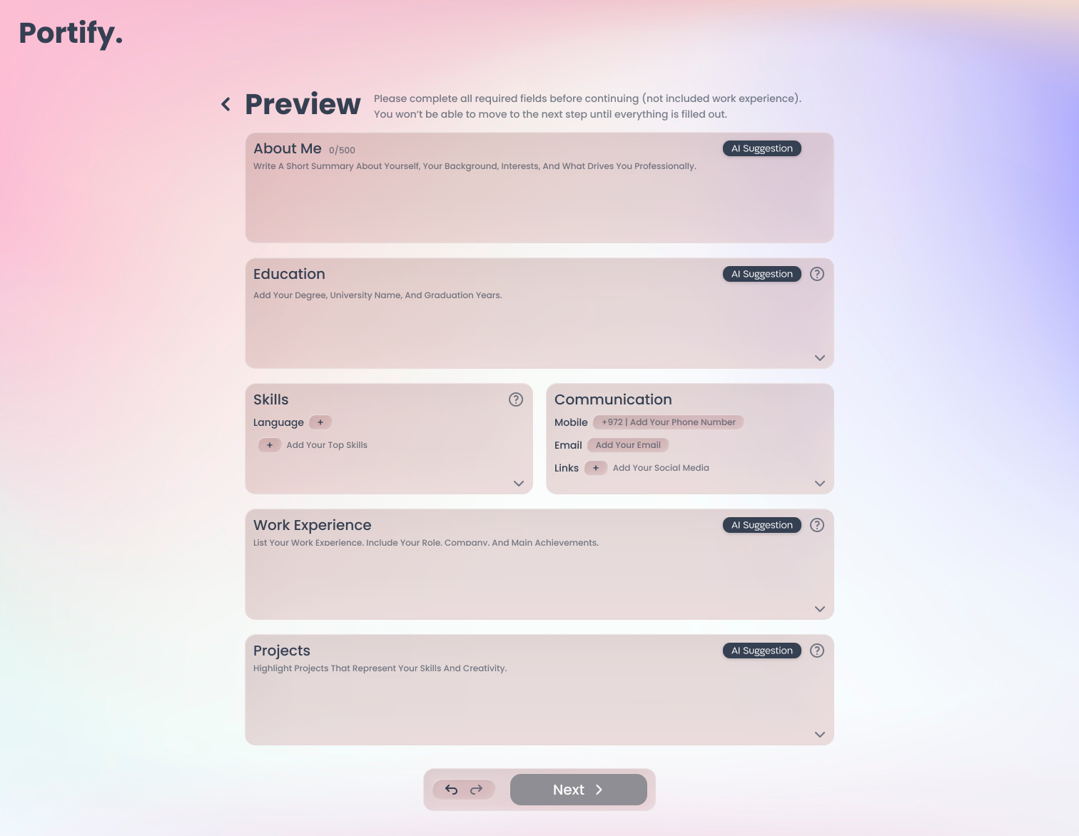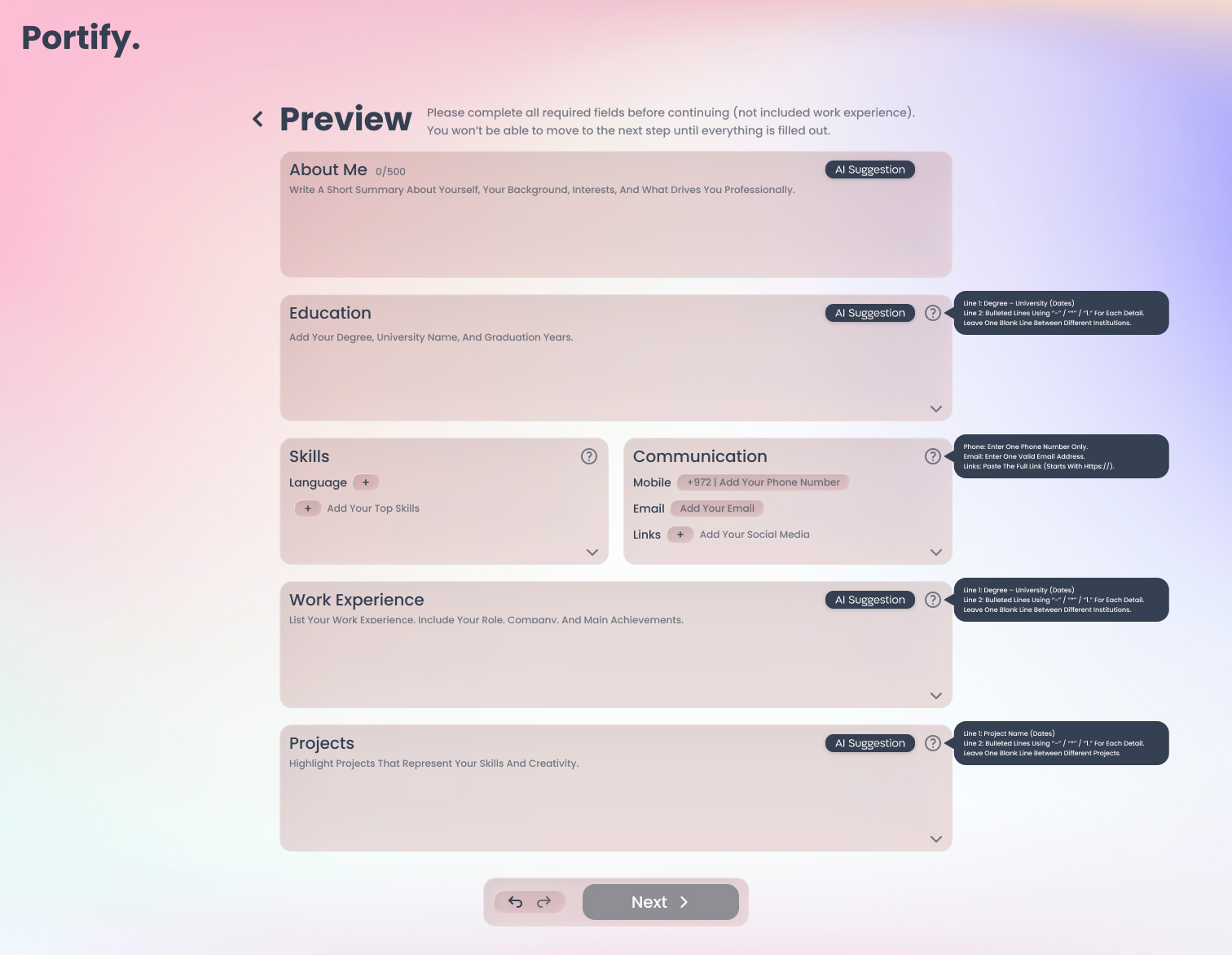 This is where Portify comes in.Portify steps in as a structured, AI-assisted platform that guides users through a clear, step-by-step process, transforming uncertainty into confident, presentation-ready portfolios.