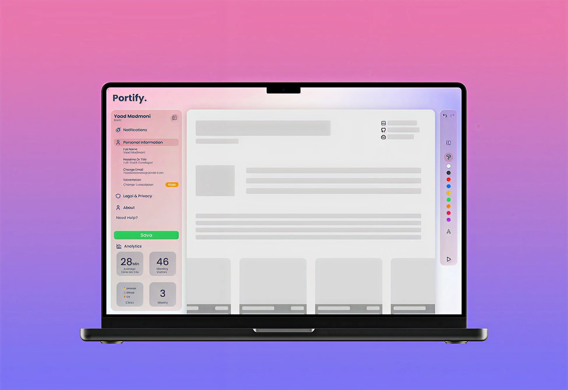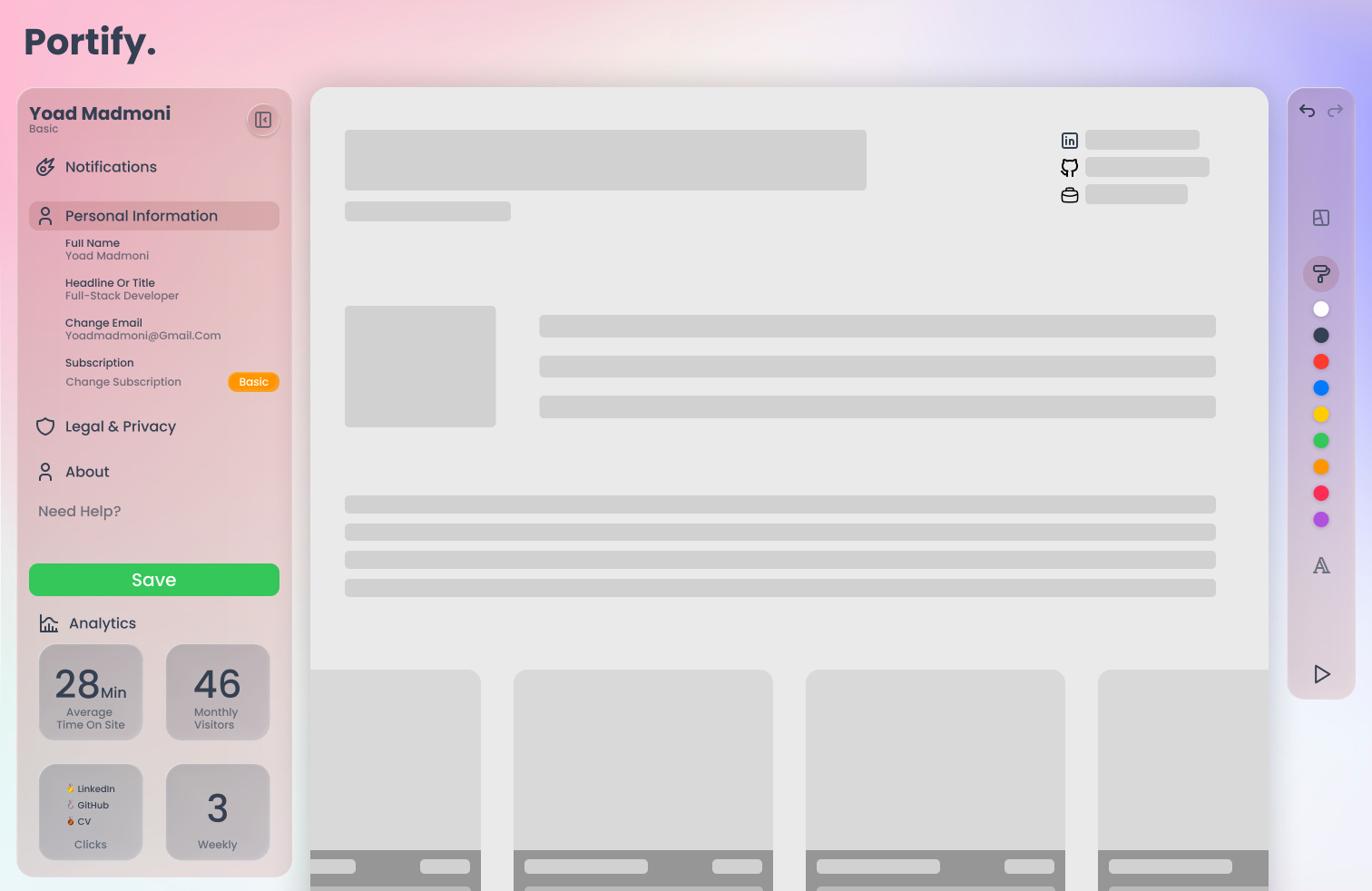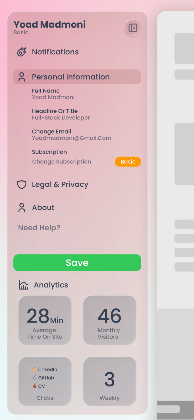 Analytics DashboardTrack portfolio performance with insights such as visitors, engagement time, and link clicks to optimize your personal branding.