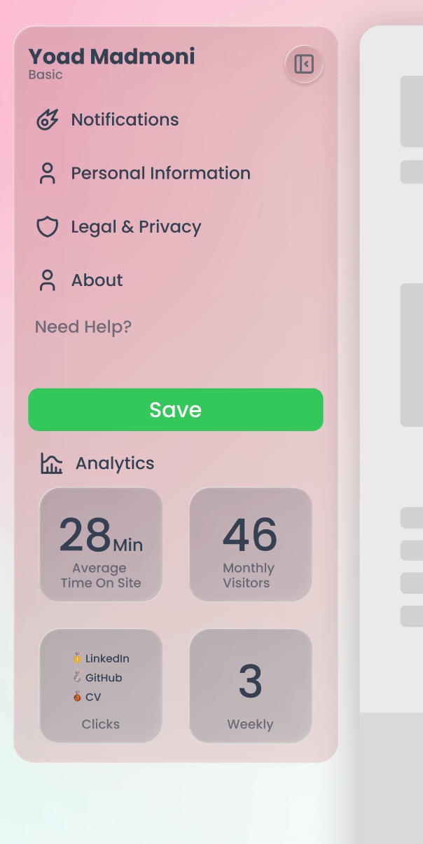Sidebar Navigation + Analytics DashboardTrack portfolio performance with insights such as visitors, engagement time, and link clicks to optimize your personal branding.